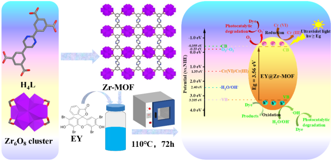 在印染废水深度处理方面,课题组构建了全新Zr-MOF及EY@Zr-MOF,实现了对水中Cr(VI)及多种活性染料的高效物理捕获与光化学降解。该材料对Cr(VI)的光还原效率高,对RB13、RR2和RR11的降解效果显著,反应动力学较Zr-MOF明显提升。研究成果以“Assembly of Eosin Y in-situ intercalated Zr-MOF composite for decontaminating Cr(VI) and reactive dyes via physical capture and photochemical purification”为题发表于《Journal of Molecular Structure》(中科院SCI二区)。化学工程与技术2022级研究生秦颖彤为论文第一作者,李庆和朱炜老师为通讯作者,西安工程大学为唯一通讯单位。
