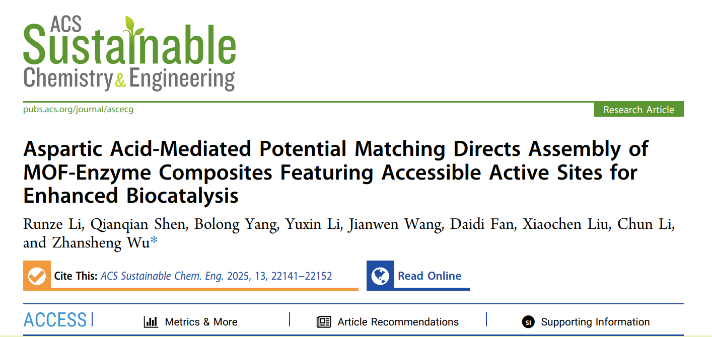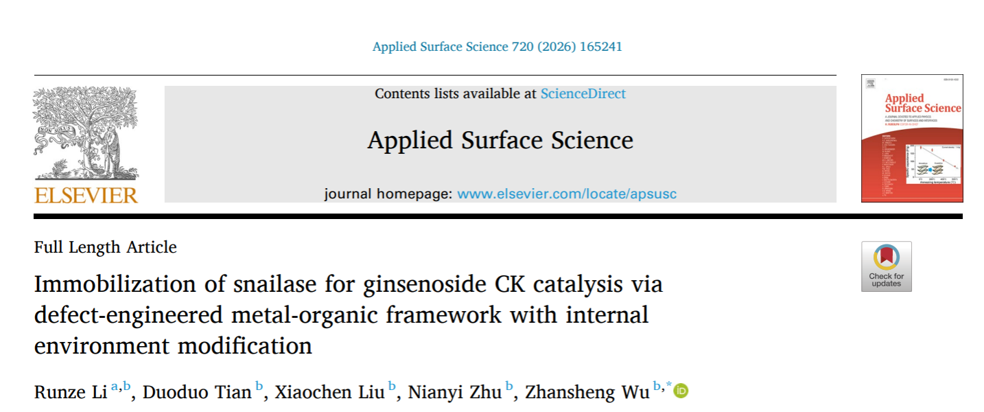 近日,我院武占省教授团队在《ACS Sustainable Chemistry & Engineering》(SCI一区,IF=7.3,TOP期刊)和《Applied Surface Science》(SCI二区,IF=6.9,TOP期刊)分别发表了题为“Aspartic acid-mediated potential matching directs assembly ofMOF-enzyme composites featuring accessible active sites for enhanced biocatalysis”、“Immobilization of snailase for ginsenoside CK catalysis via defect-engineered metal-organic framework with internal environment modification”的研究论文。论文第一作者为石河子大学&西安工程大学联合培养博士研究生李润泽,通讯作者为西安工程大学武占省教授,西安工程大学申倩倩副教授、杨博龙副教授、刘啸尘副教授、西北大学范代娣教授、清华大学李春教授合作指导。