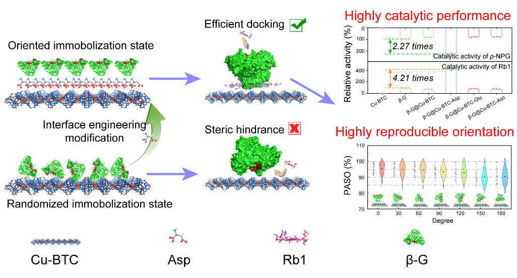 酶在固定化载体界面上的随机吸附会导致催化活性位点的构象畸变、底物结合口袋结构错配以及传质通道的堵塞,从而严重限制了催化效率。作者提出了一种基于天冬氨酸介导的势能匹配计算引导型界面工程策略。通过在关键界面引入天冬氨酸残基来调节界面势能,蛋白能够以最优构象自发吸附在金属-有机框架(MOF)载体表面,从而实现酶分子空间取向的高可控性(活性位点取向概率>90%)。结果表明,与未修饰体系相比,该策略使β-葡萄糖苷酶(β-G)的催化活性提高了4.21倍,微观质量传递效率提高了5.64倍,最终实现了人参皂苷CK86.6%的总转化效率。这项工作证明了界面势能匹配在同时稳定酶构象和最大化传质可及性方面的作用,为酶固定化提供了一个通用平台。