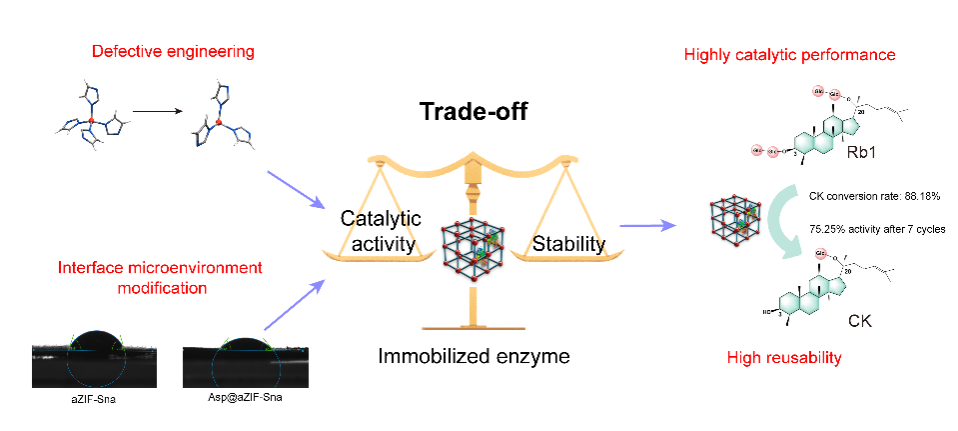 金属有机框架(MOFs)通过模拟细胞的隔室化结构来包封酶,从而促进天然酶在极端环境中的应用。克服活性与稳定性之间的权衡,仍是酶固定化领域当前面临的挑战。作者利用天冬氨酸(Asp)修饰结构缺陷型金属有机框架,为酶分子创造有利的内部环境,并部分减轻了载体缺陷对蛋白质产生的不利影响。同时,载体缺陷的结构改善了底物的质量传递。因此,所得的Asp@aZIF-Sna展现出优异的热稳定性(80 °C时保留44.77%活性)和操作耐久性(经七次循环后仍保留75.25%活性)。48小时内实现了88.18%的转化率,与ZIF-8包封的复合酶相比提高了6.06倍。本研究表明,通过天冬氨酸对结构缺陷载体进行改性并优化其内部环境,是提高酶活性和稳定性的有效策略。