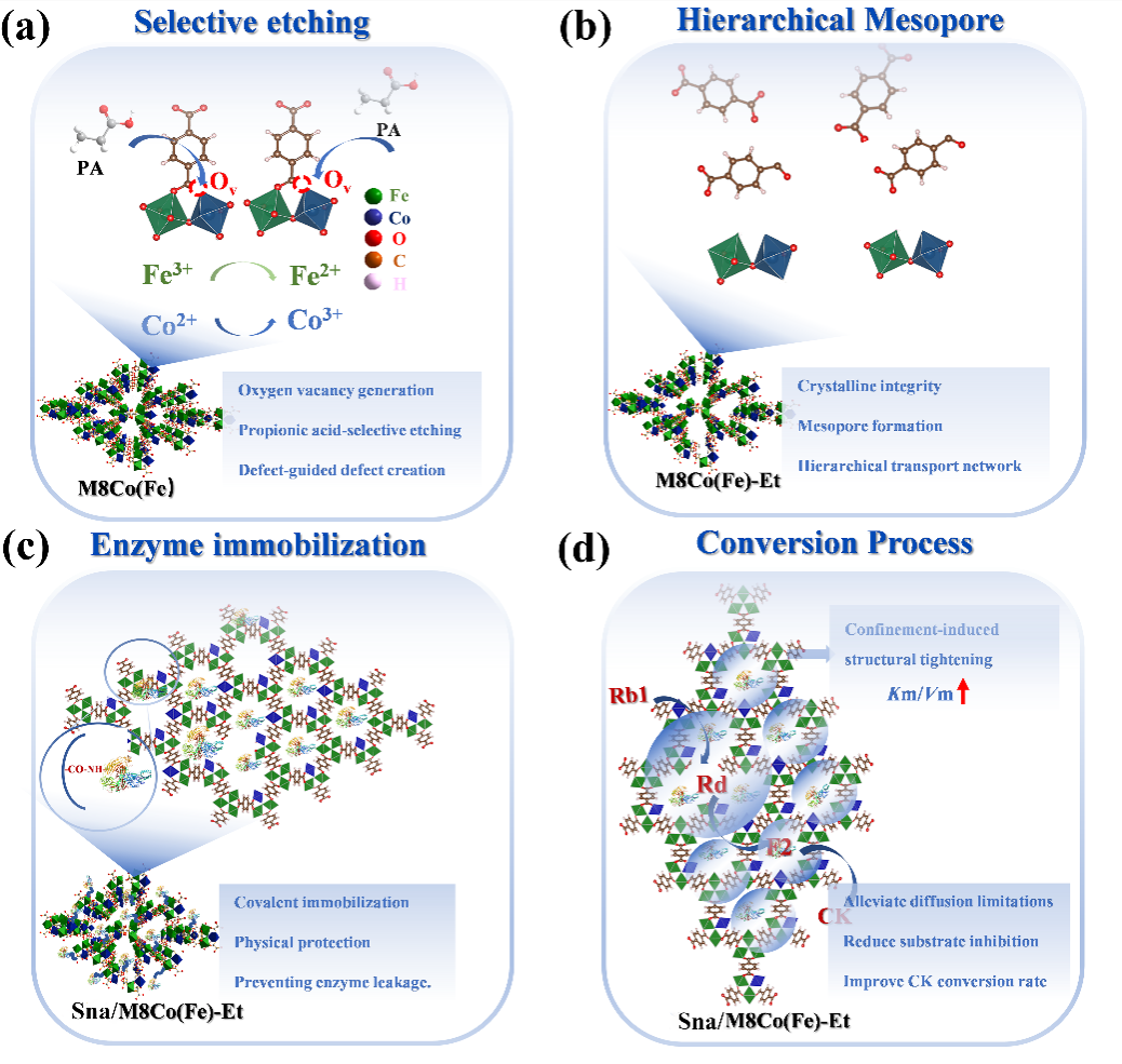 在多级孔MOF酶固定化材料设计方面,课题组提出双金属竞争配位与缺陷工程协同策略,以MIL-88B (Fe)为基底,通过Fe3+/Co2+竞争配位生成氧空位并引导丙酸选择性刻蚀,构建互连多级孔结构,再经碳二亚胺介导共价交联固定蜗牛酶,制备出Sna/M8Co (Fe)-Et复合催化材料,实现了稀有人参皂苷CK的高效酶促合成。该复合催化材料的催化效率较游离酶显著提升,CK转化率高且产物纯度高,循环稳定性优异。研究成果以“Synergistic Bimetallic Competition and Defect Engineering in Hierarchically Porous MOF-Enzyme Composites to Enhance the Enzymatic Synthesis of Rare Ginsenoside CK”为题发表于国际期刊《International Journal of Biological Macromolecules》(SCI一区,IF=8.5)。西安工程大学联合培养博士研究生张蒙蒙为论文第一作者,武占省和申倩倩老师为通讯作者。