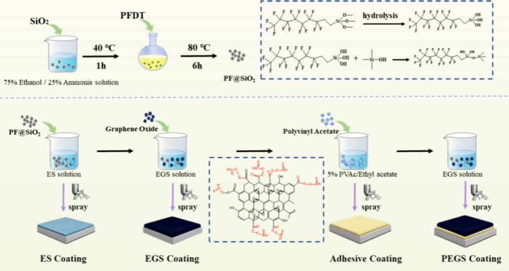 近日,以西安工程大学环境与化学工程学院赵亚梅教授、2024级化学工程与技术专业研究生顾小祺为核心成员的研究团队,在Langmuir(中科院二区,IF=3.9)期刊发“A Robust Bilayer Superhydrophobic Coating Based on Graphene Oxide with Integrated Photothermal Effects for EfficientAnti-/Deicing and Durability Applications”的研究论文,系统揭示了PEGS超疏水涂层的高效防除冰机制与耐久性能,为极端低温环境下装备防护提供了新的理论依据与技术方案。