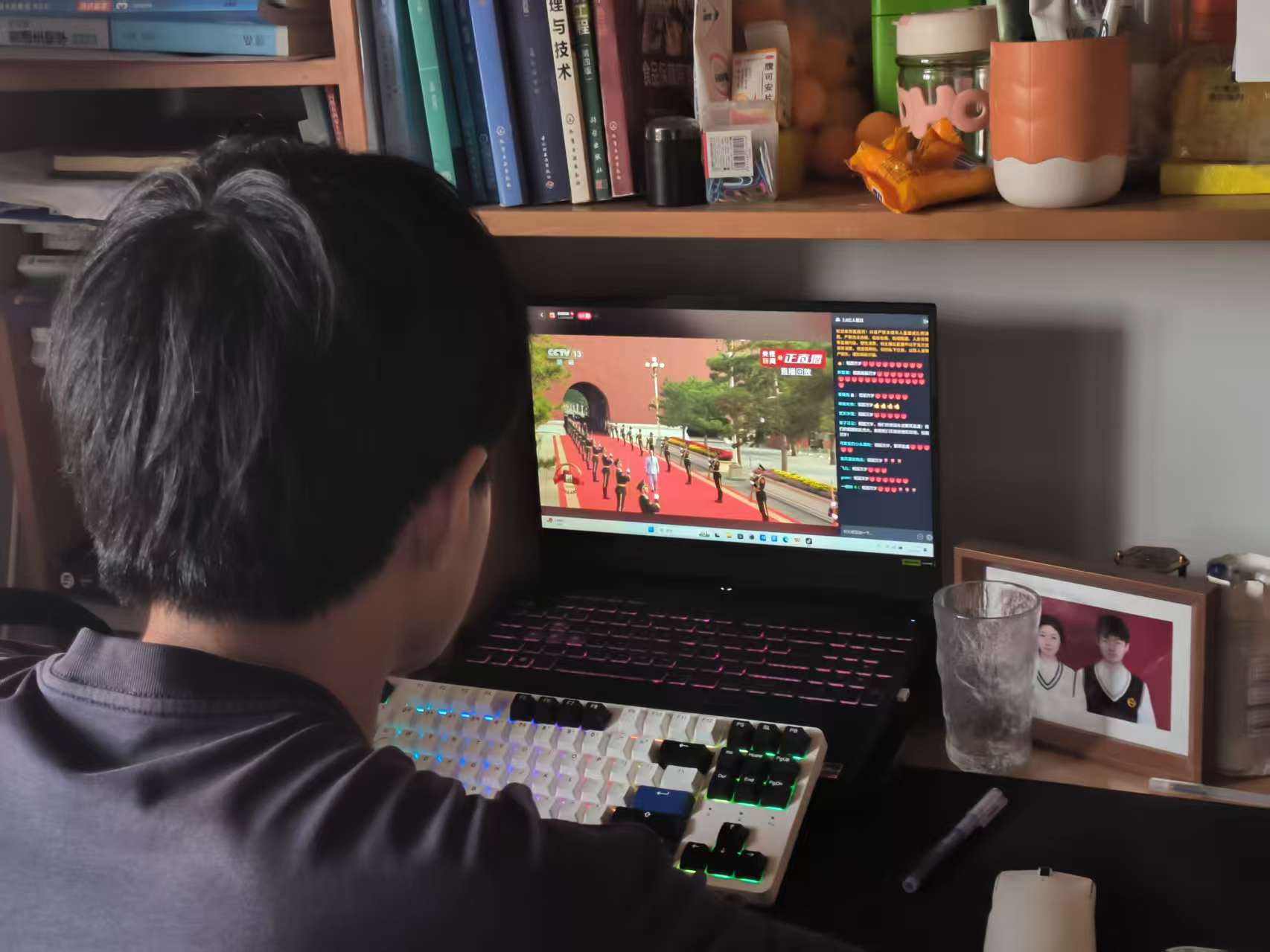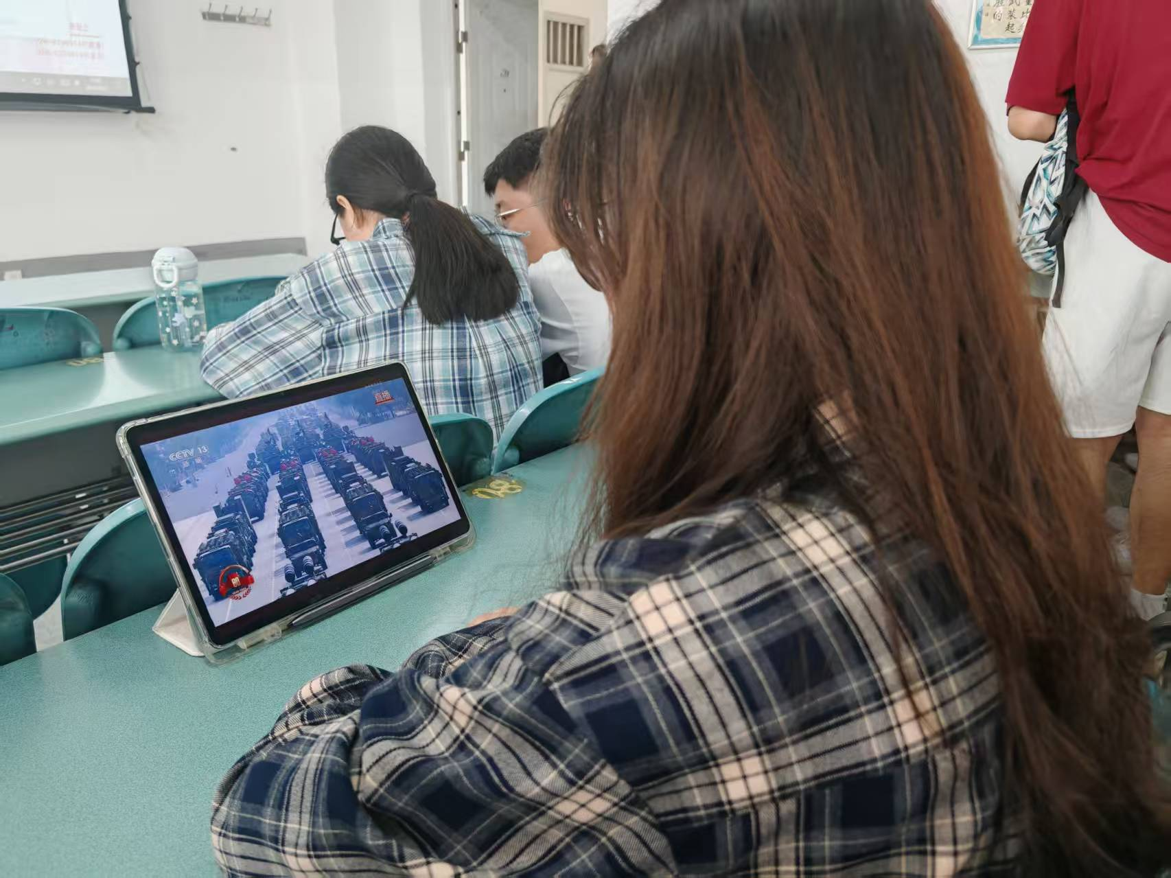 当日,同学们怀着崇敬与激动的心情,认真观看了阅兵的每一个精彩瞬间。空中护旗梯队携国旗、军旗绘出庄严红迹,徒步方队踏正步复刻先辈征程,装备方队列阵亮相,DF-5C、DF-61等大国重器尽显国防成就,空中梯队以精准编队展军队风貌。