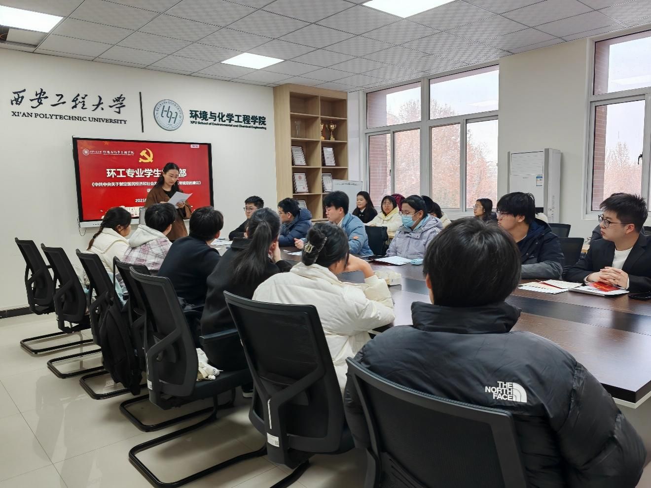 为深入学习贯彻党的二十届四中全会精神,准确把握国家中长期发展战略部署,11月16日,环境工程专业学生党支部在学院会议室举行主题党日活动,专题学习习近平总书记关于《中共中央关于制定国民经济和社会发展第十五个五年规划的建议》的说明精神。活动由支部书记任子瑜主持,支部全体党员参加。
