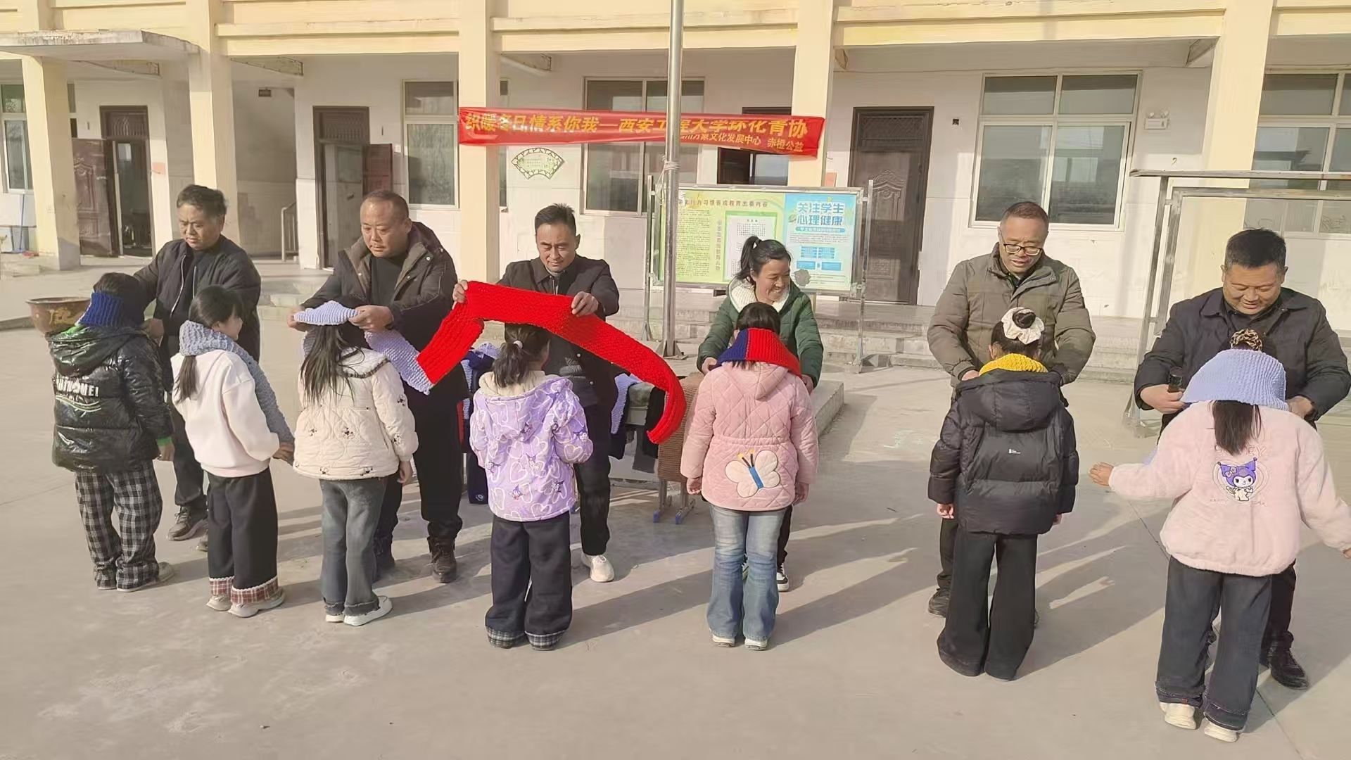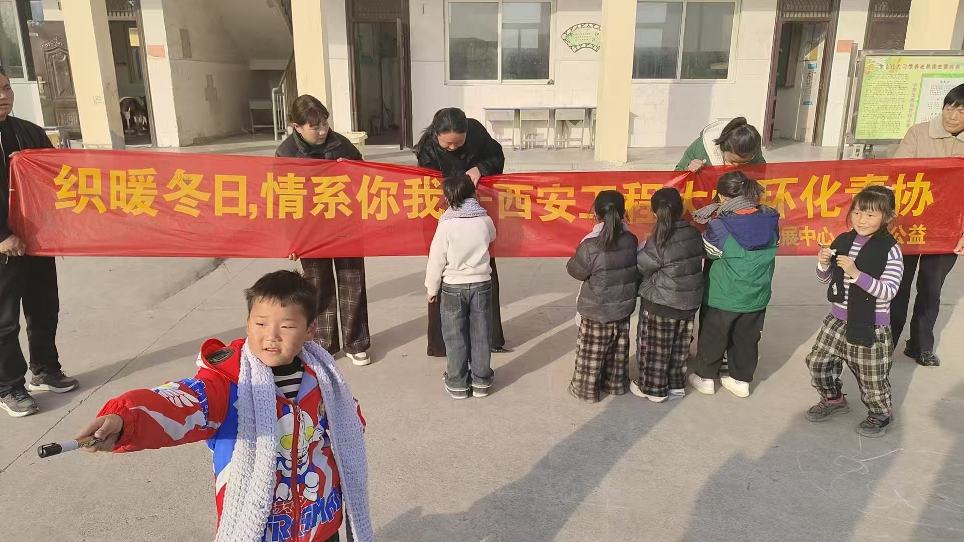 12月2日,活动的高潮在乡村小学的操场上上演。志愿者们与孩子们共同展开“织暖冬日,情系你我一一西安工程大学环化青协”的红色横幅,冬日的阳光洒在每个人的笑脸上。当鲜红的围巾被轻轻围上孩子的脖颈,当柔软的毛线帽被戴在头上,操场上响起阵阵欢笑。孩子们戴着新围巾,围成一圈,收到我们的善意,孩子们纯真的笑脸如同绽放的花朵。