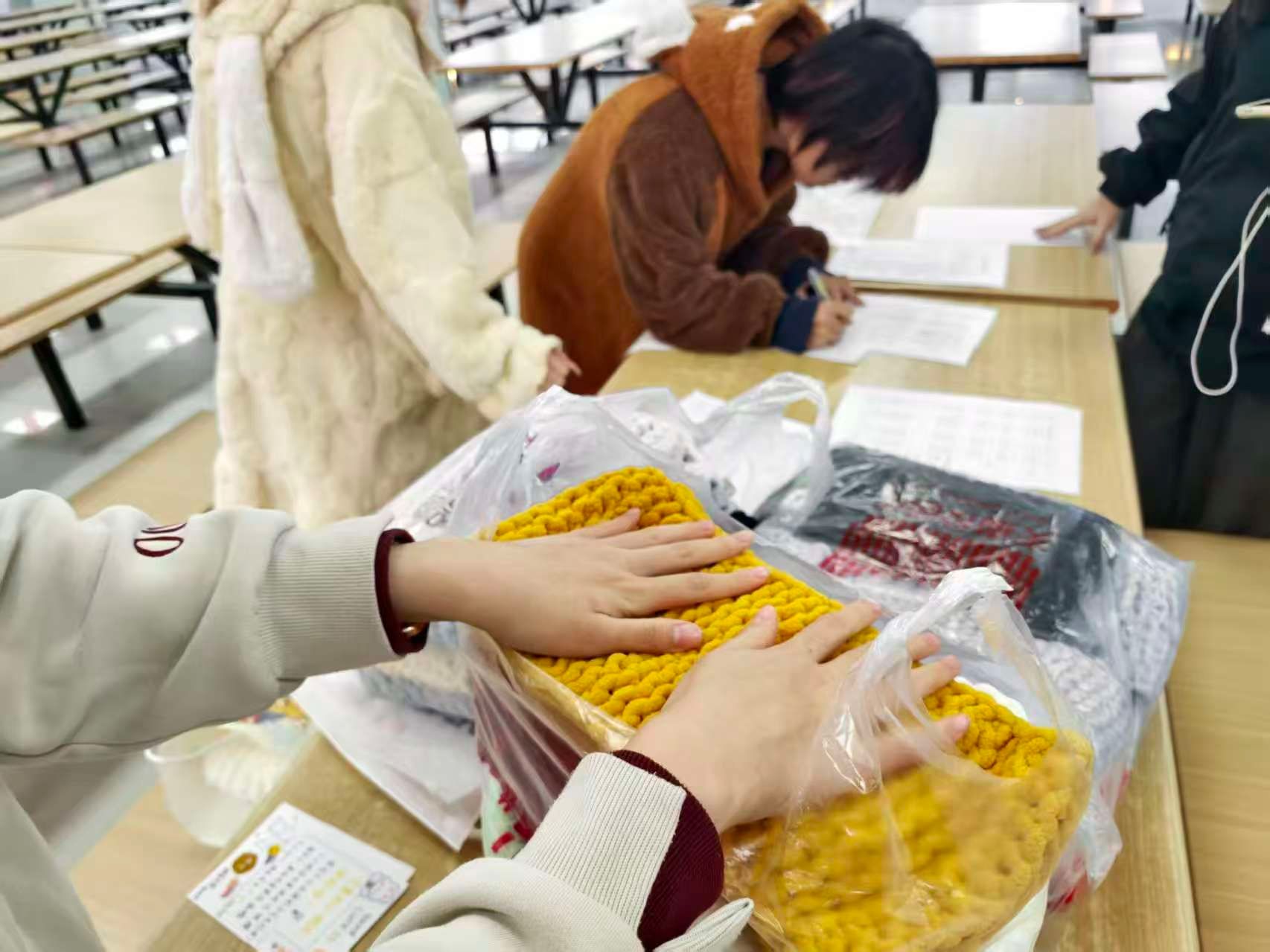 11月15日活动初期,校园食堂中志愿者们领取学院提供毛线为远方的孩子们准备“温暖包裹”。他们书写一张张明信片上,手写的祝福语与卡通插画相映成趣:“勇敢一点,你比自己想象的更好”“相逢的意义在于彼此照亮”,字里行间满是温情。